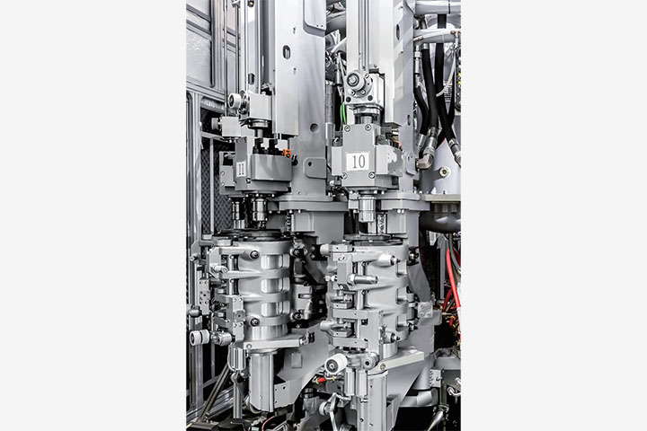 标准模腔(制瓶容积 0.25-2.5L)旋转式吹瓶机,应用于各类饮料等 PET 瓶的生产,产能可达 58500 瓶/小时。