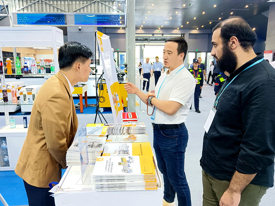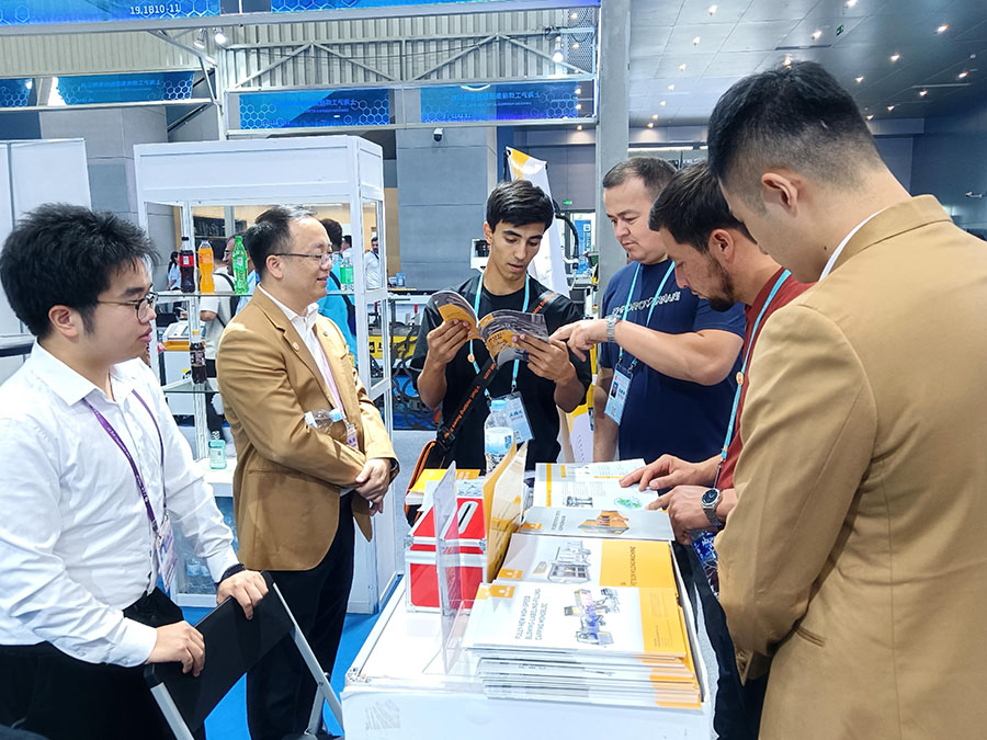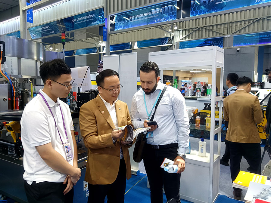 在对贴标机进行了近距离的观摩与太阳成集团tyc138团队的专业解说下,客户对我们的技术创新有了更为全面深刻的了解并纷纷给予高度评价。现场外国客户来访不断,洽谈其欢,相继约定工厂的实地考察与合作意向。