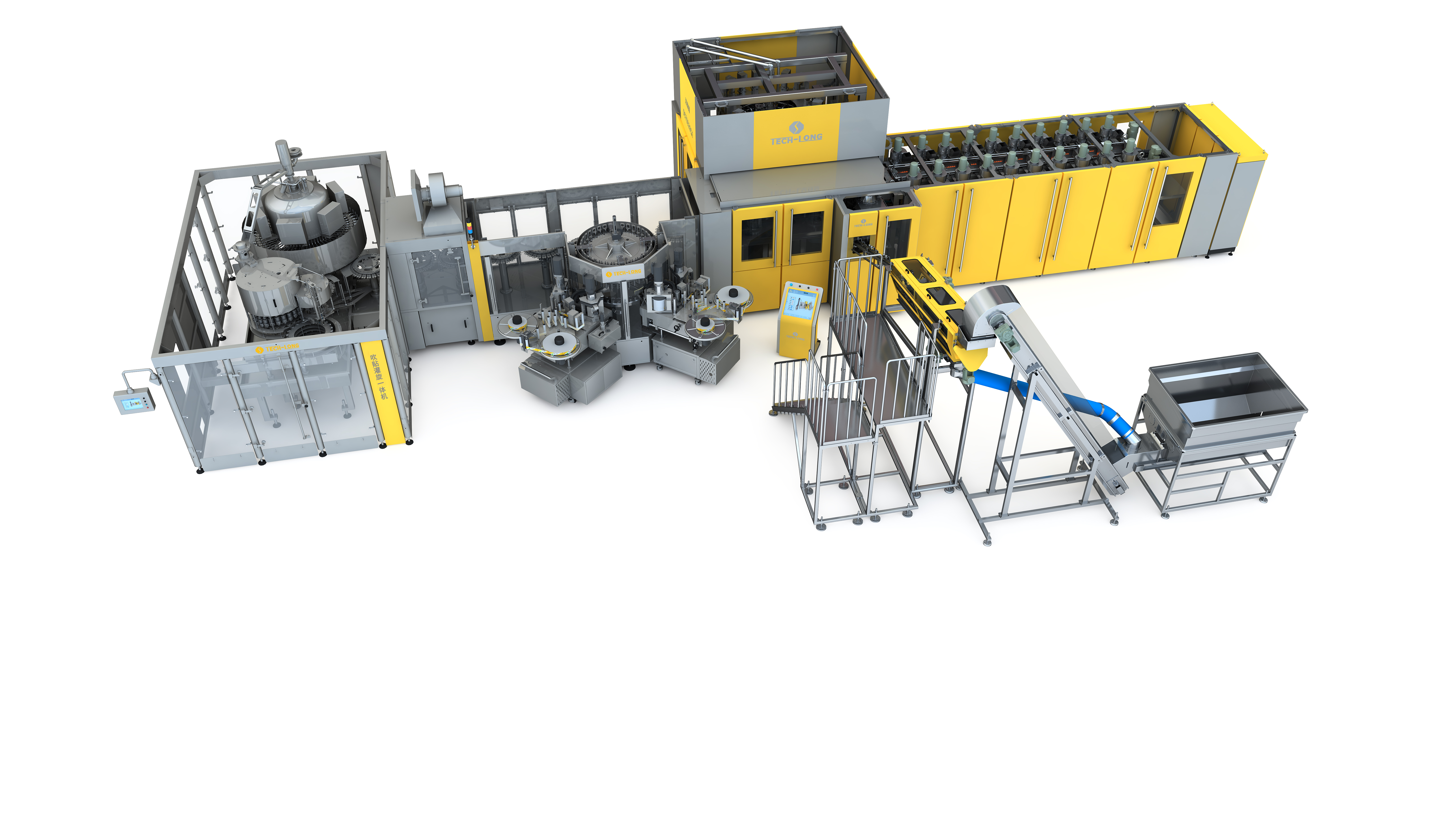 吹贴灌旋一体化布局,与传统生产线相比节约空间20%~30%,省去贴标机前端无压力输送、瓶身风干系统等设备。